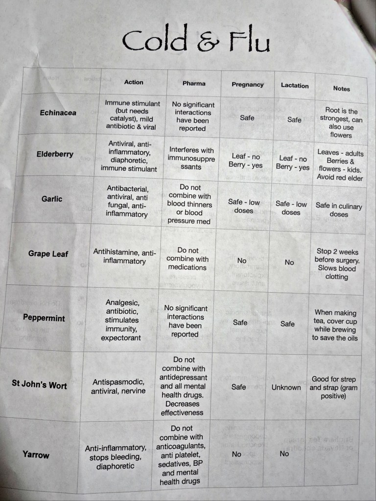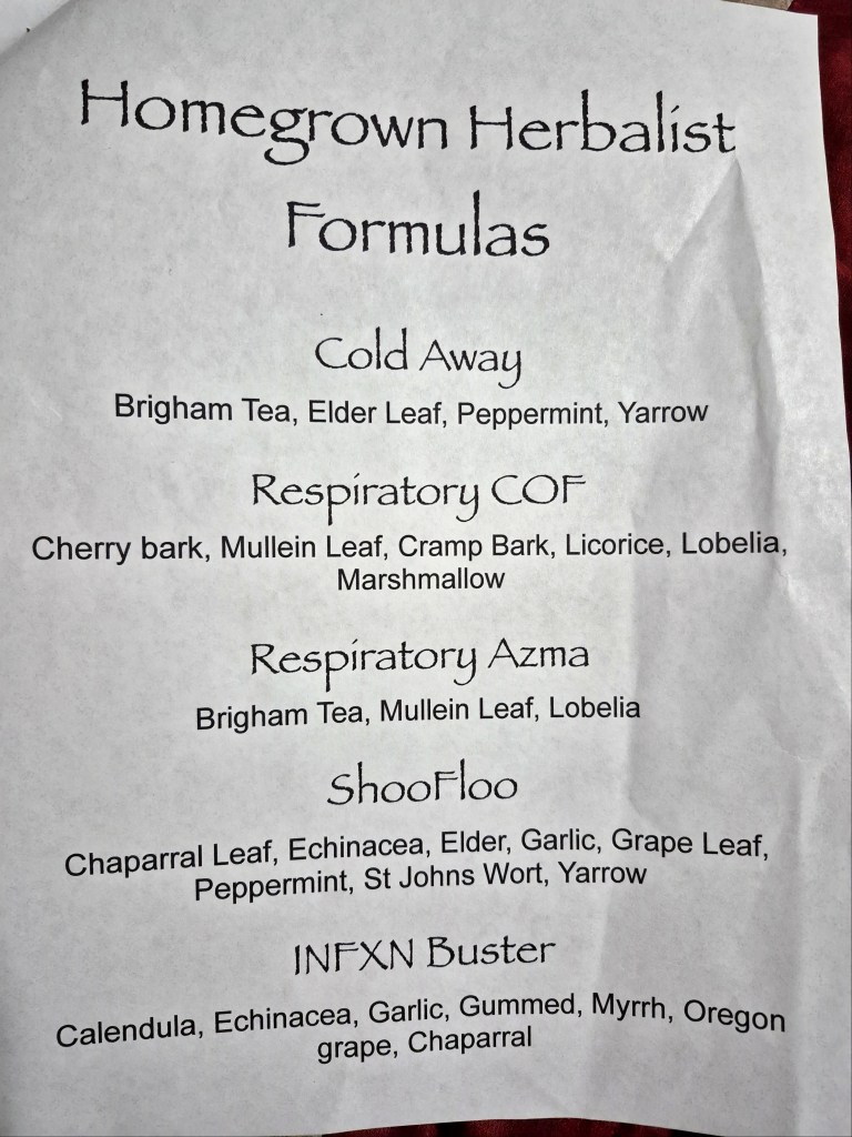 A member shared her herbal remedies for cold/flu season. She recommends using Homegrown Herbalist for supplies and online classes. Reference books are best used for herbs/remedies and growing one’s own herb garden is a bonus. Herbs can be mixed with apple juice to make them more palatable, especially for kids.